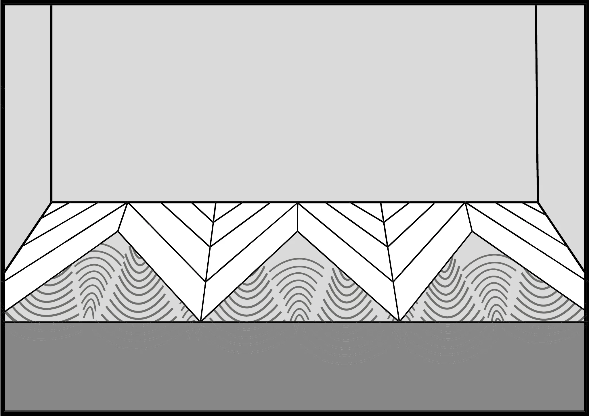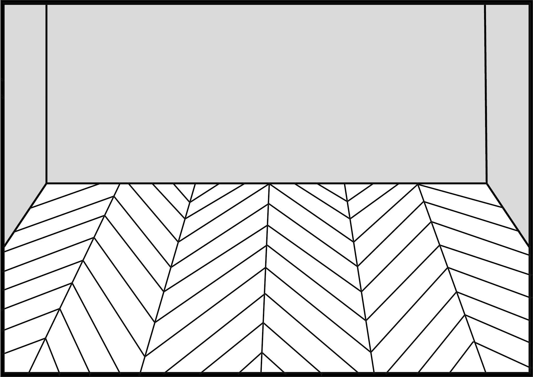 2. Divide the room in half and start assembling. Glue the first three rows of boards together at the edges. When installing, make sure that the grooves of the boards are facing in the direction of the chevron arrangement. Remember about the 7/16” (10 mm) wall expansion joint. Cut the boards to size and assemble according to the numbering as shown in the picture. Place the boards symmetrically to the walls.