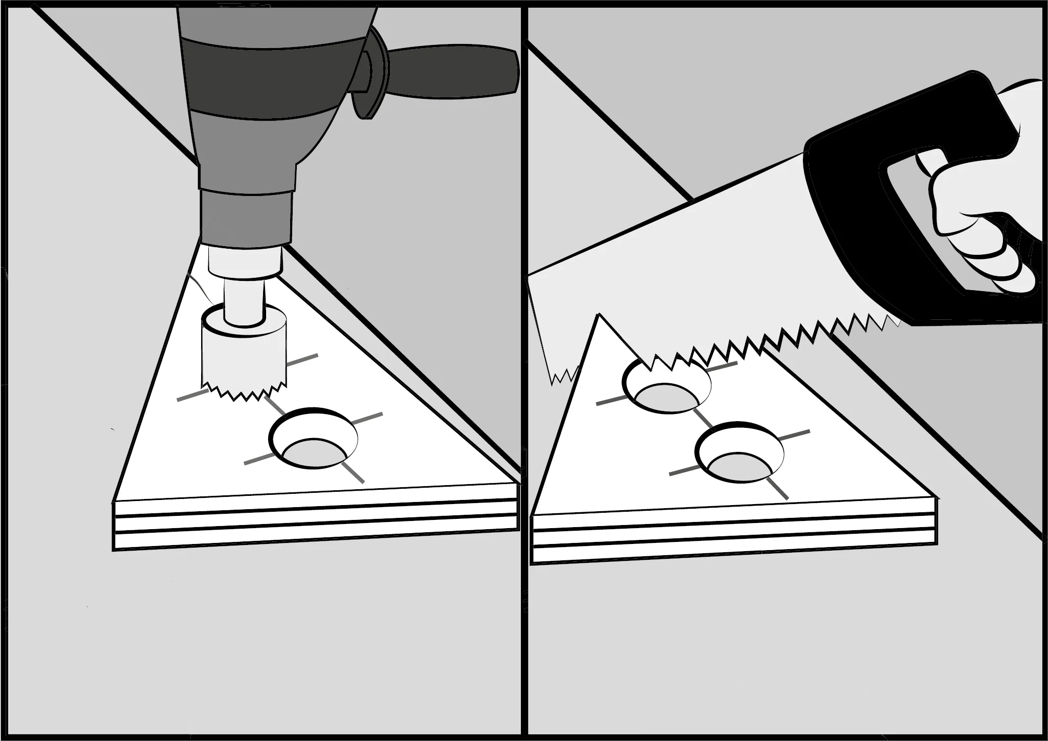 8. Cut the holes and then cut with the saw along the line as shown in the figure.