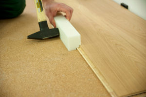 15. Using the tapping block, connect the Barlinek board on its longer edge. During the installation use a tapping block and a hammer to fit in the boards together along the longer edge. Adjust the tapping block along the entire longer edge of the board and tap it with hammer.