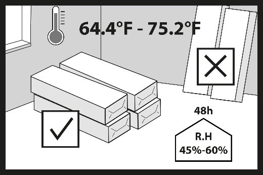 Packages containing hybrid boards must be handled with care during transport and unloading to avoid any mechanical damage. Hybrid boards  in their original packaging should be stored in a dry place, in a horizontal position, on pallets or wooden beams. There must be a free space of at least 3’’ (75 mm) between the hybrid board package and the ground. Hybrid boards should be stored in their original package in the room where they are to be laid for at least 48 hours to allow them to acclimatize. The air temperature should be between +64.4 °F and +75.2 °F (+18°C and +24°C). Relative air humidity between 45% and 60%.