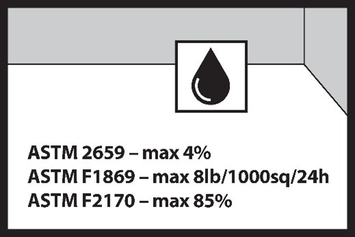 • Less than 8 pounds per 1000 sq/ ft. per 24 hours when using Calcium Chloride test (ASTM F1869)