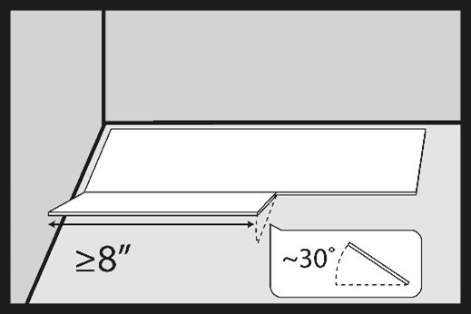 Insert the first SmartWood board in the second row of board at an angle of approximately 30° into the joint of the board in the first row of board. The recommended length of the installed SmartWood board is minimum 8’’ (203 mm).