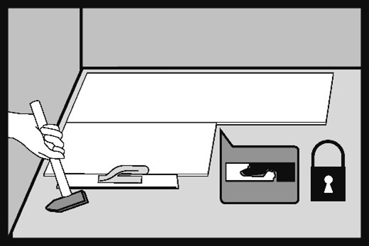 After lowering the board being installed and connecting the short sides, fasten the lock by tapping with a hammer in the order 1 and 2.