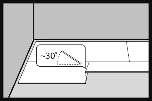 Insert the second board in the second row of the floor at an angle of approx. 30° into the lock of the board installed in the first row.