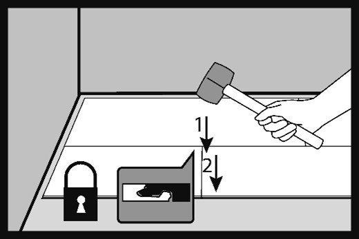 Gently tap the edge connection with a rubber mallet and fasten the lock in the order of tapping 1 and 2. When the lock is fastened correctly, the surface layer of the boards should be flush and there should be no visible difference in level between the connected elements.