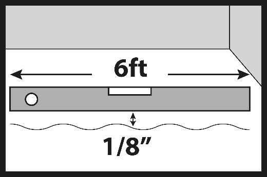 The maximum acceptable unevenness may be up to 1/8’’ (3 mm), measured over a length of 6 ft (2 m). Local unevenness should not exceed 1/13’’ (2 mm) over a length of 3,37 (1 m).
