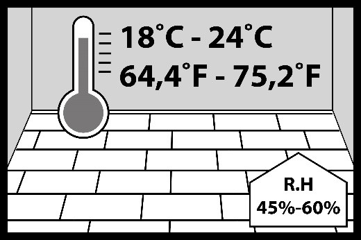 During use, the room temperature should be between +64.4°F (+18°C) and +75.2°F (+24°C) and the relative humidity between 45% and 60%.