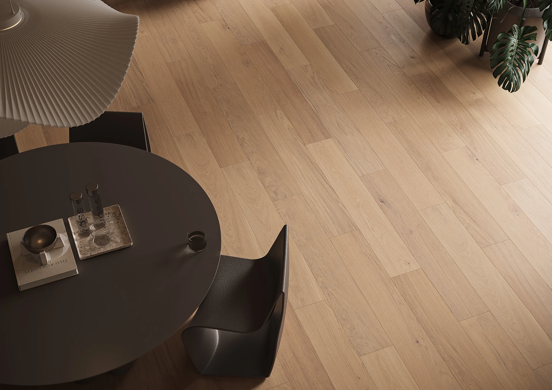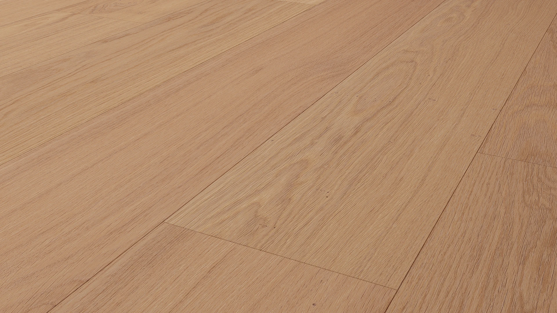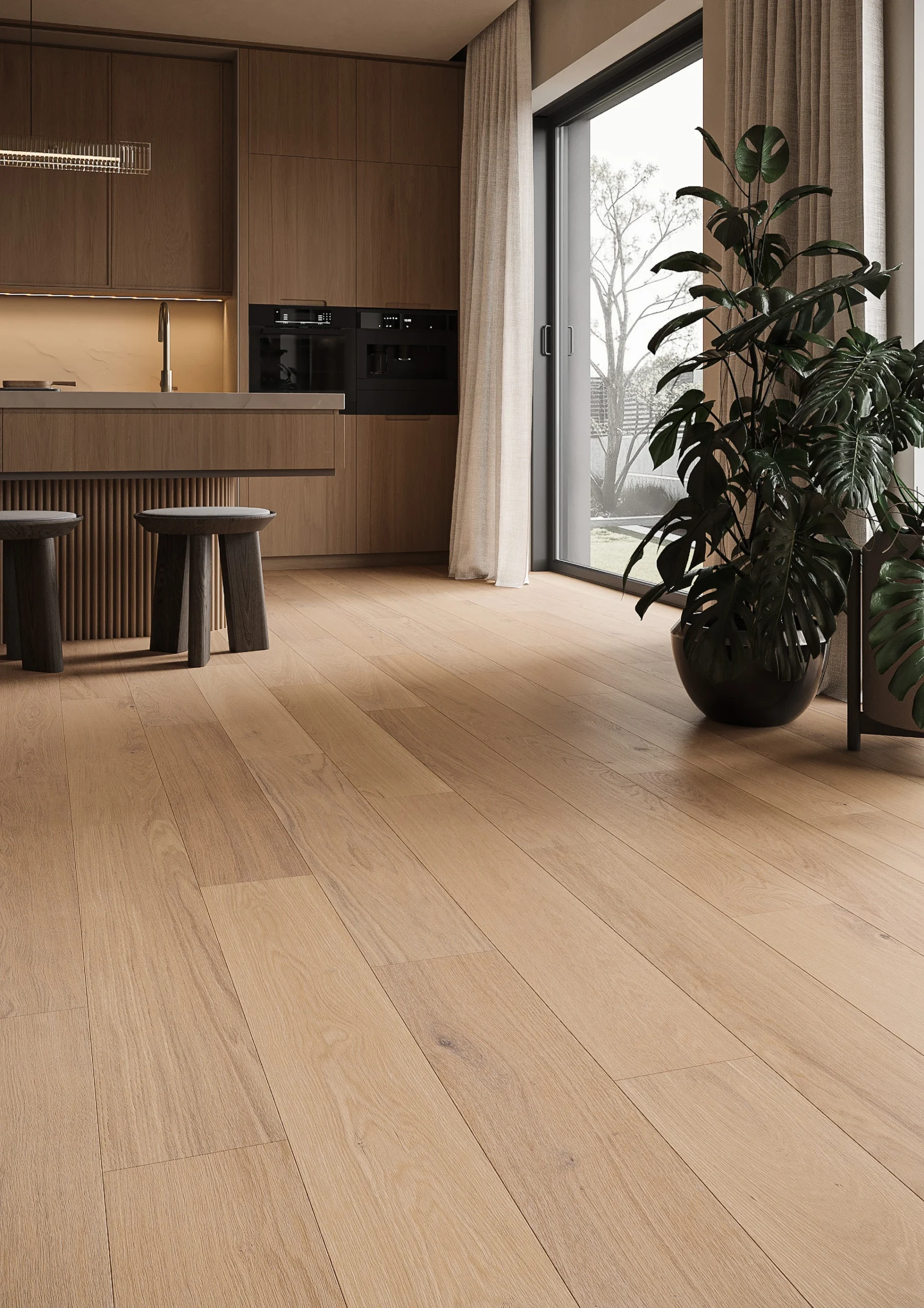 A lightly whitewashed oak floor combines subtle elegance with a natural style. The delicate whitening accentuates the grain pattern, brightens the wood, and gives the interior a fresh, harmonious character.