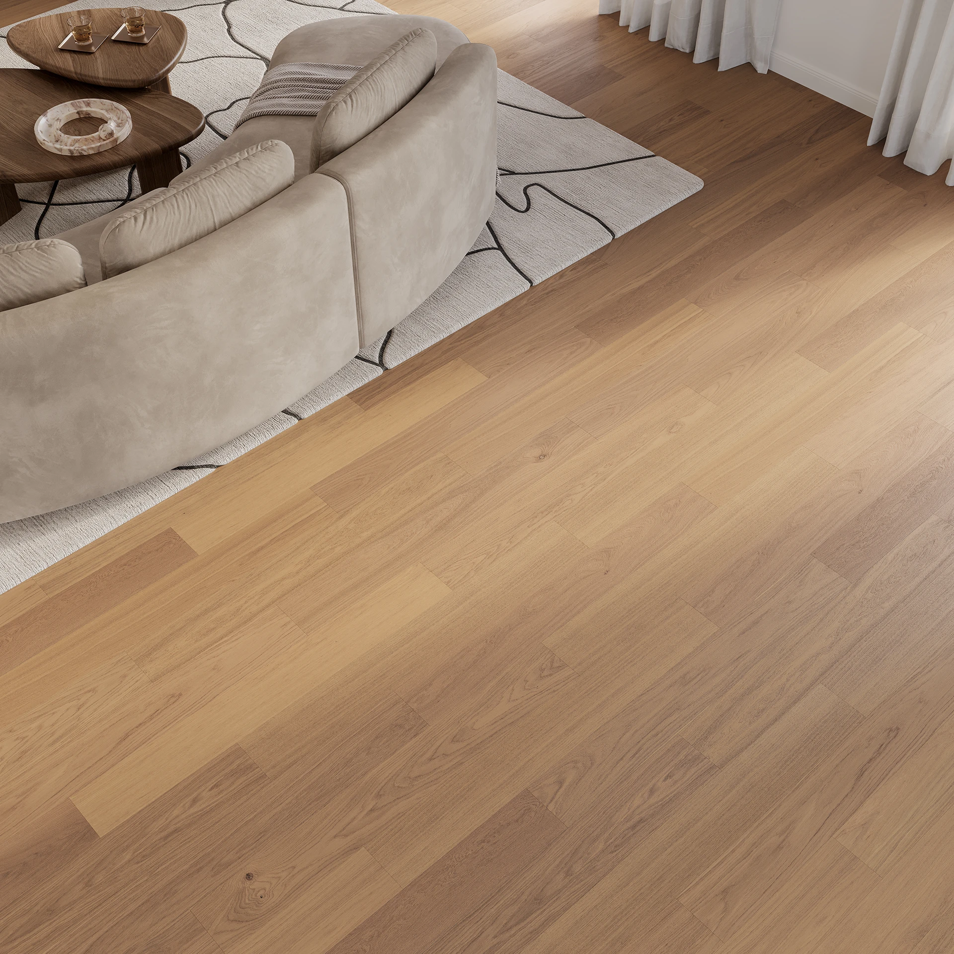 An oak floor in a creamy shade that brings authenticity, purity, and subtle minimalism to the interior.