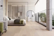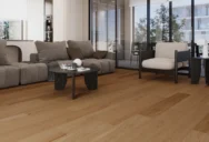 An oak floor in a warm antique brown shade that combines classic style with durability. The brushed boards emphasize the natural grain and the noble structure of the wood.