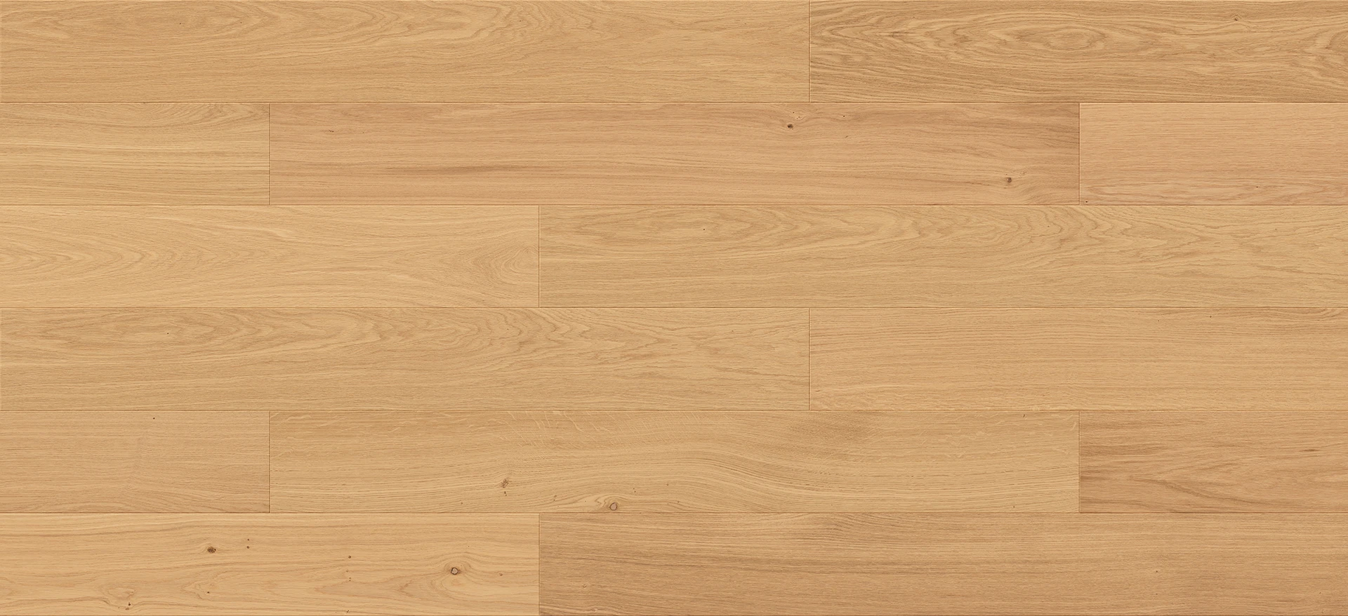 A natural oak floor with subtly highlighted wood features. The brushed surface beautifully accentuates the grain pattern, giving the floor an authentic character and a refined look.