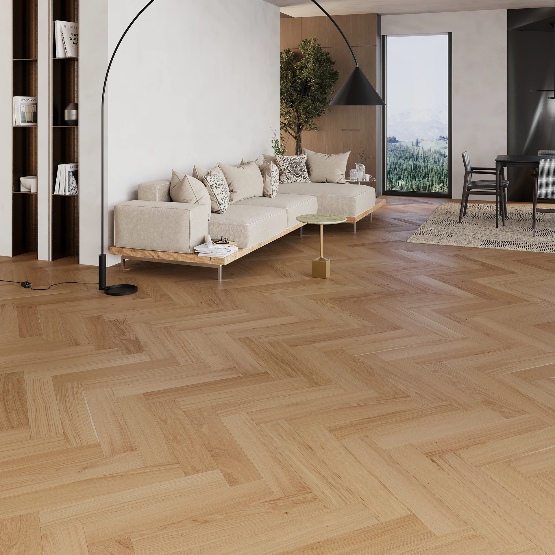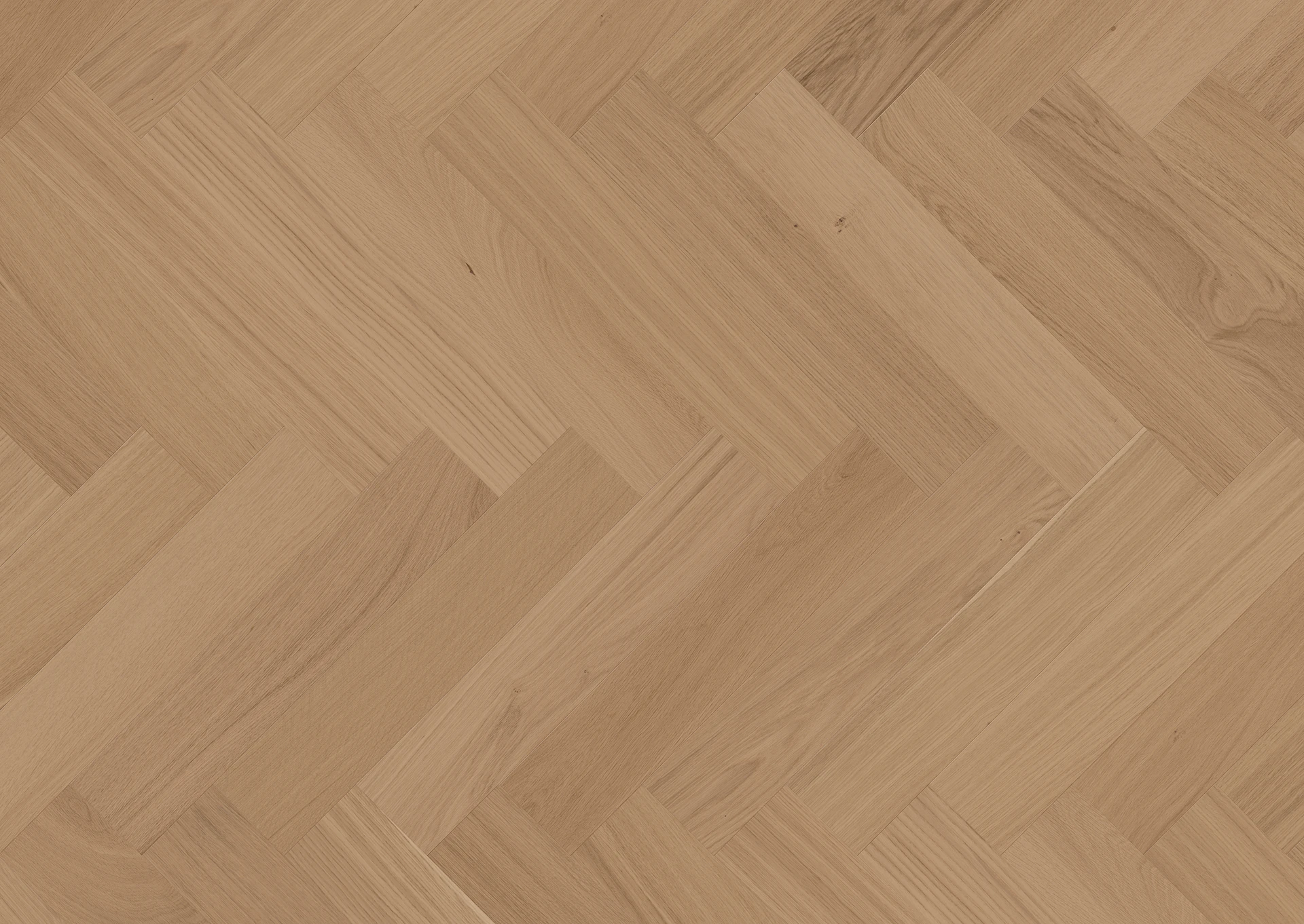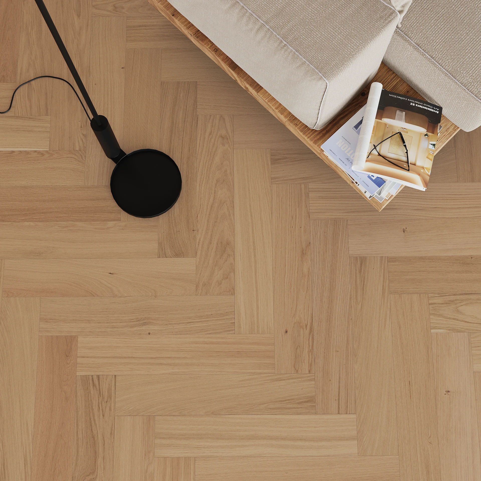 An oak floor in a classic herringbone pattern with a transparent finish combines subtle elegance with the natural character of wood.