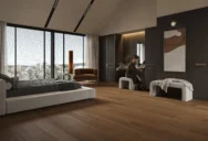 An oak floor in a light beige-gray shade combines modern subtlety with the natural character of wood. Its neutral, muted tone creates an elegant backdrop that suits a variety of interior styles.