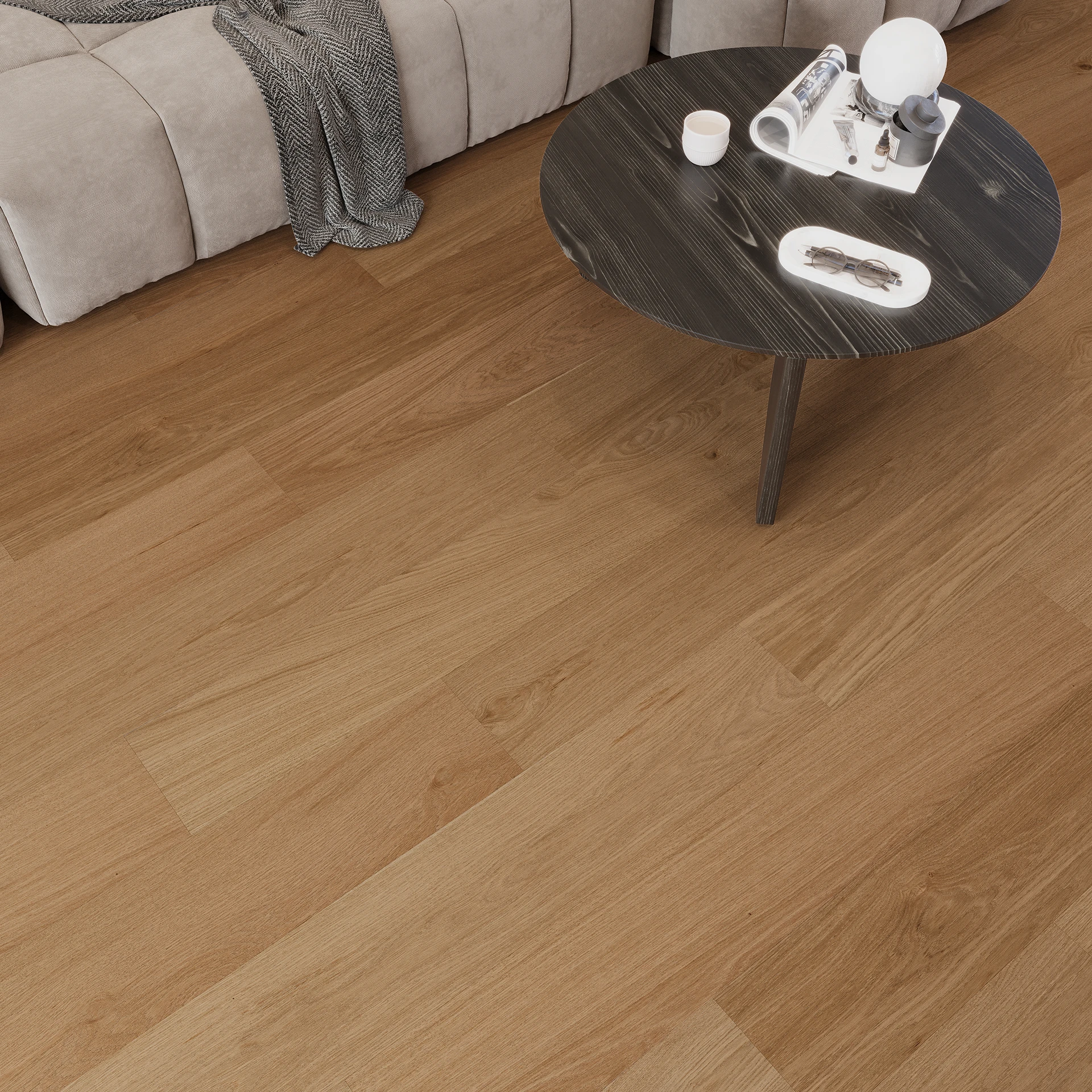 An oak floor in a deep brown shade impresses with elegance and a bold style. The rich color accentuates the natural grain, adding sophistication and exceptional depth to the interior.